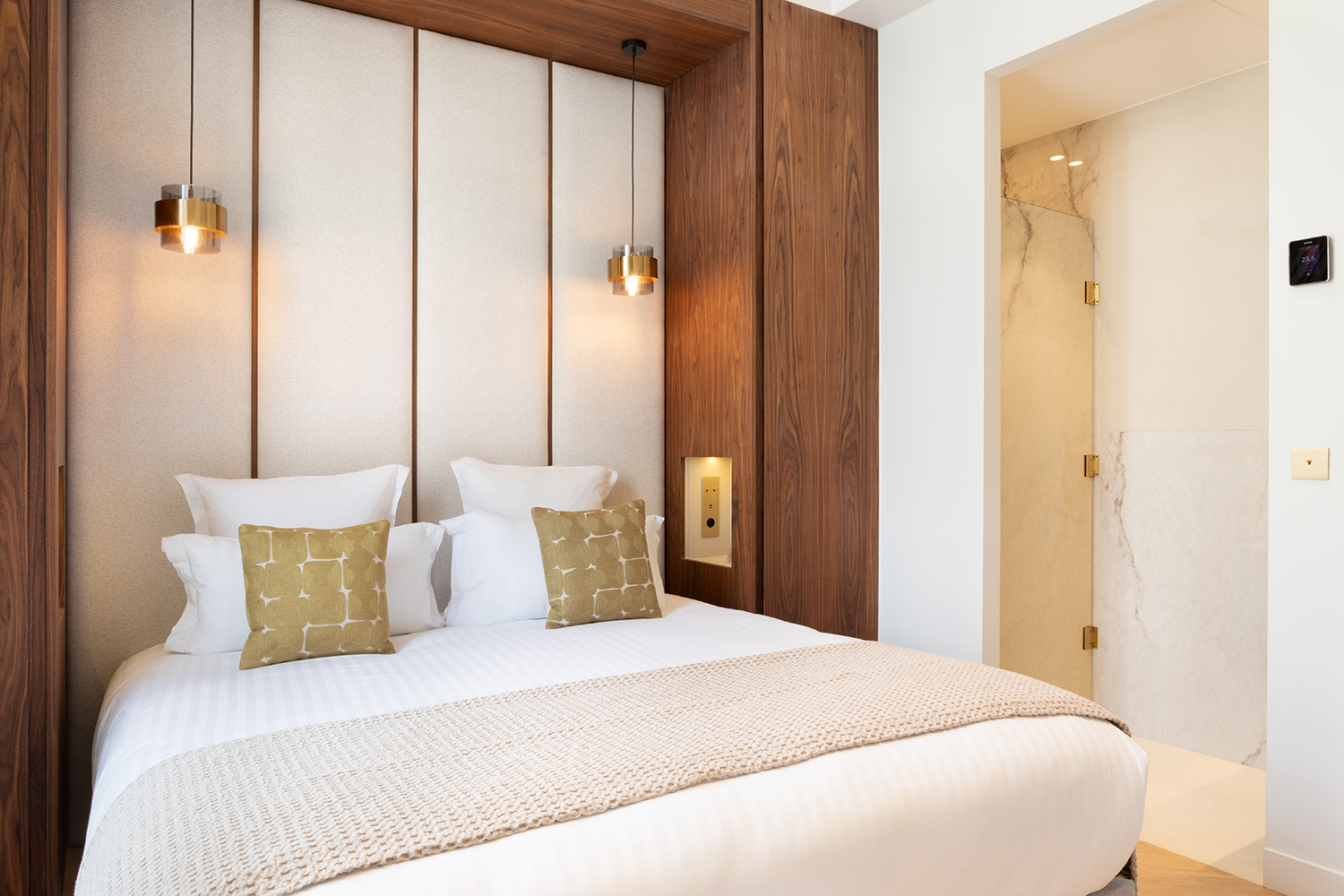 La chambre dispose d’un lit King-Size, d’une télévision connectée et de nombreux rangements, avec une salle de bain attenante et douche à l’italienne. Les WC sont séparés.