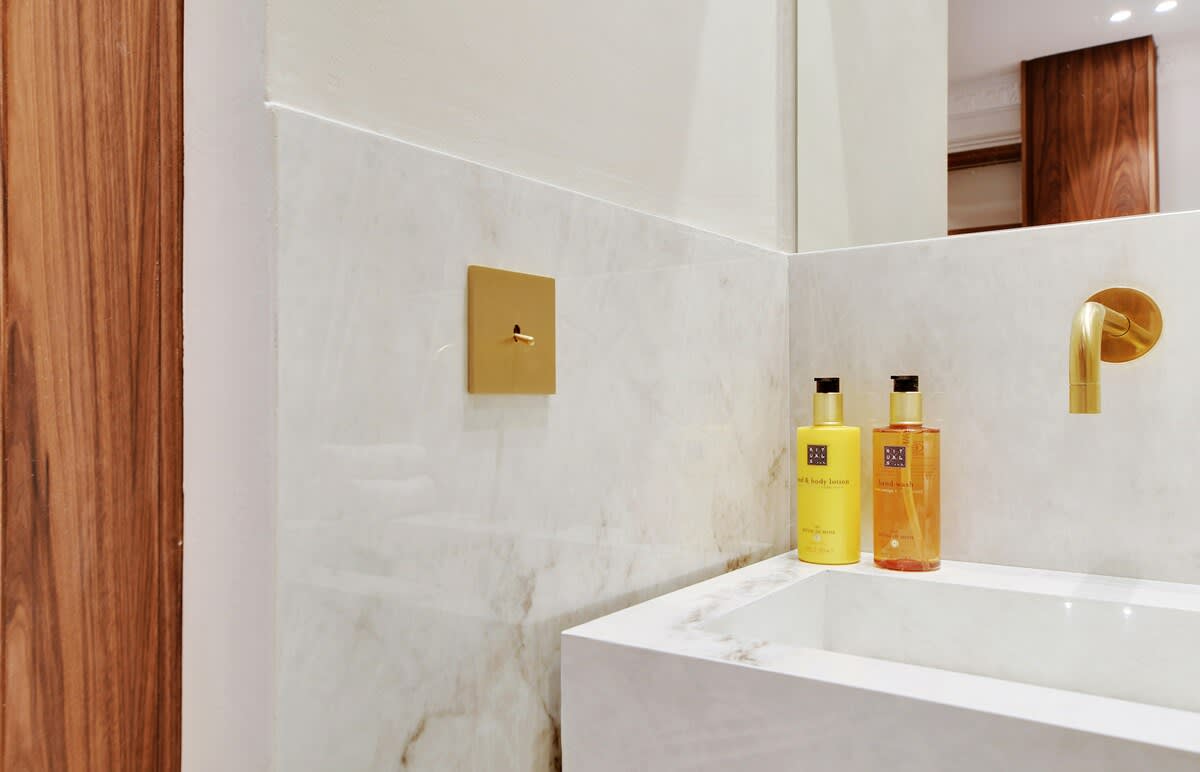 Du sol au plafond, cet appartement est décoré avec des matériaux de qualité et intemporels. Des matériaux de qualité, tels que le parquet hongrois, le marbre et les diverses moulures murales typiques des appartements haussmanniens, sont à l'honneur.
