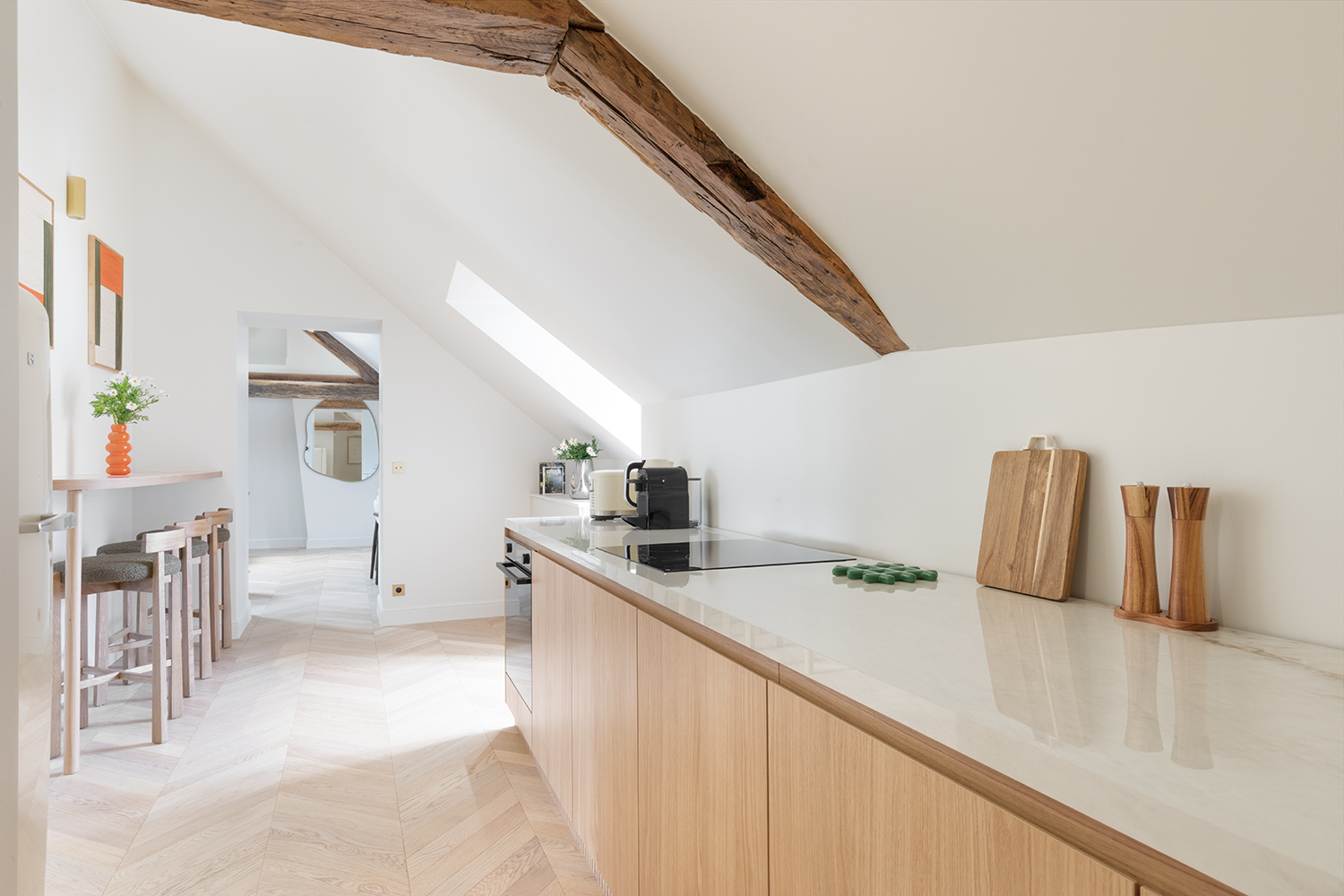 Ce qui rend cet appartement véritablement unique, c’est le charme des poutres apparentes, qui apportent une touche d’authenticité, subtilement mêlée à une décoration raffinée et un mobilier luxueux.