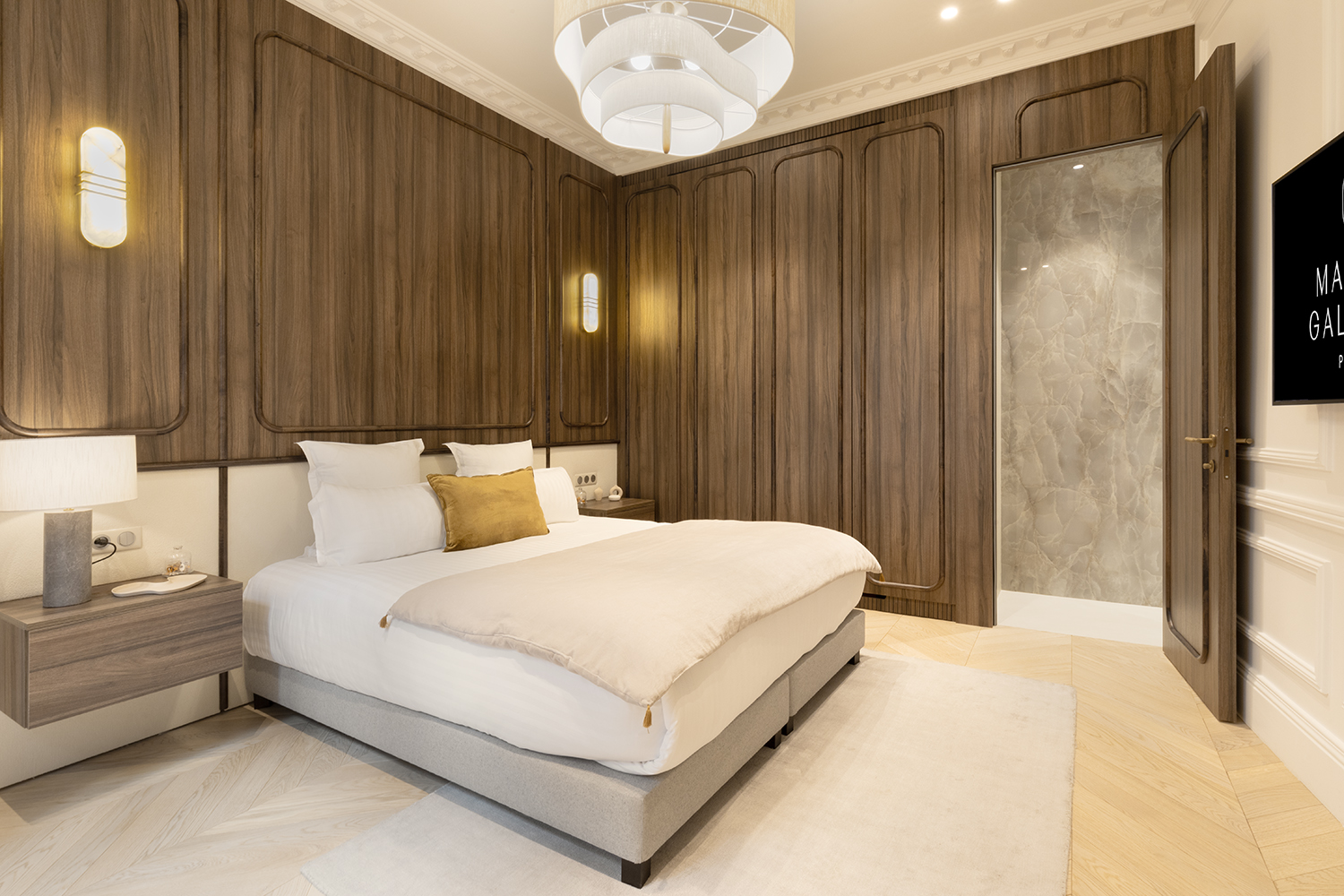 On the first floor of a beautiful building with an elevator, set around a charming and peaceful courtyard, Maison Galante has designed an apartment that reflects the luxury of its prestigious surroundings.